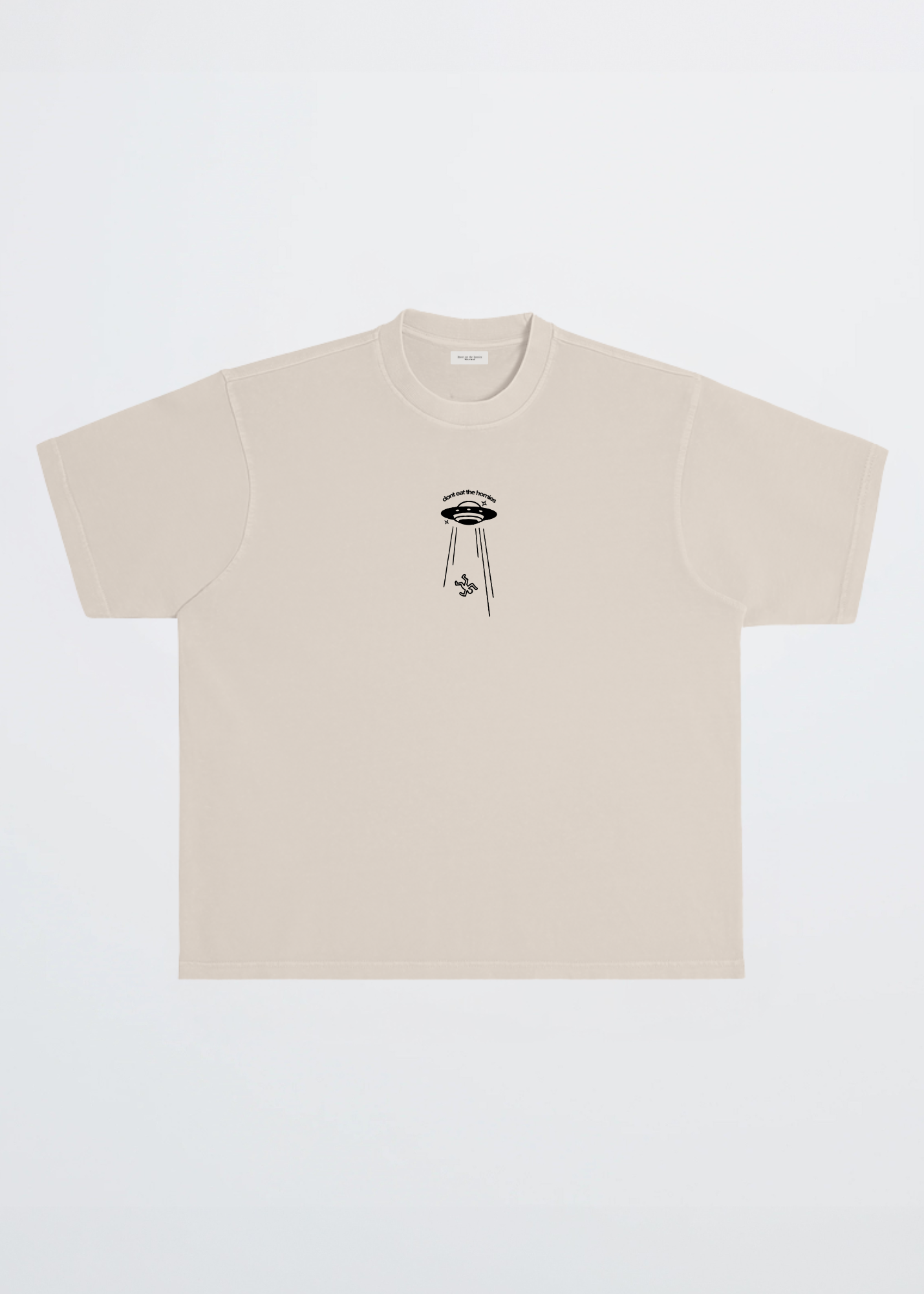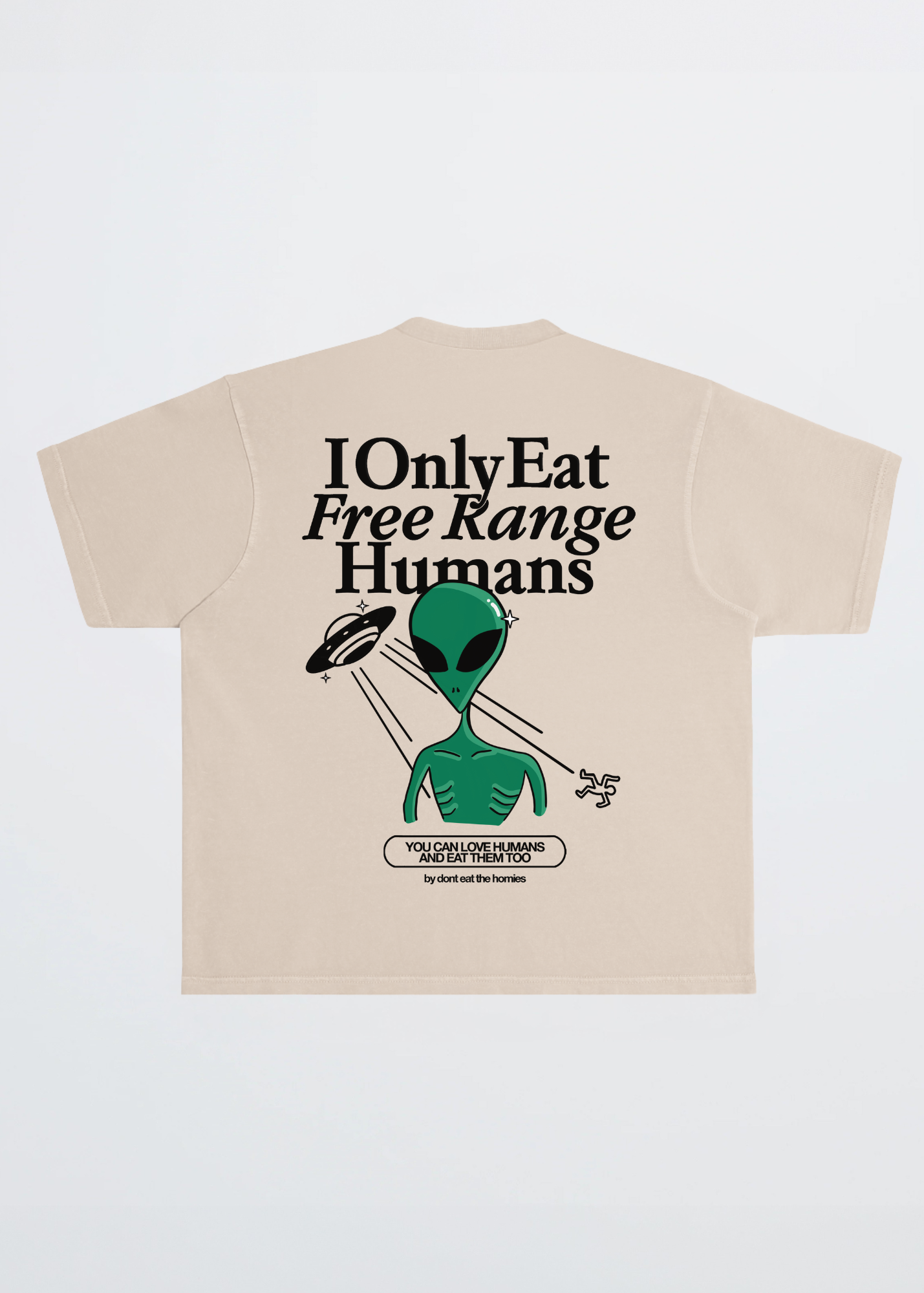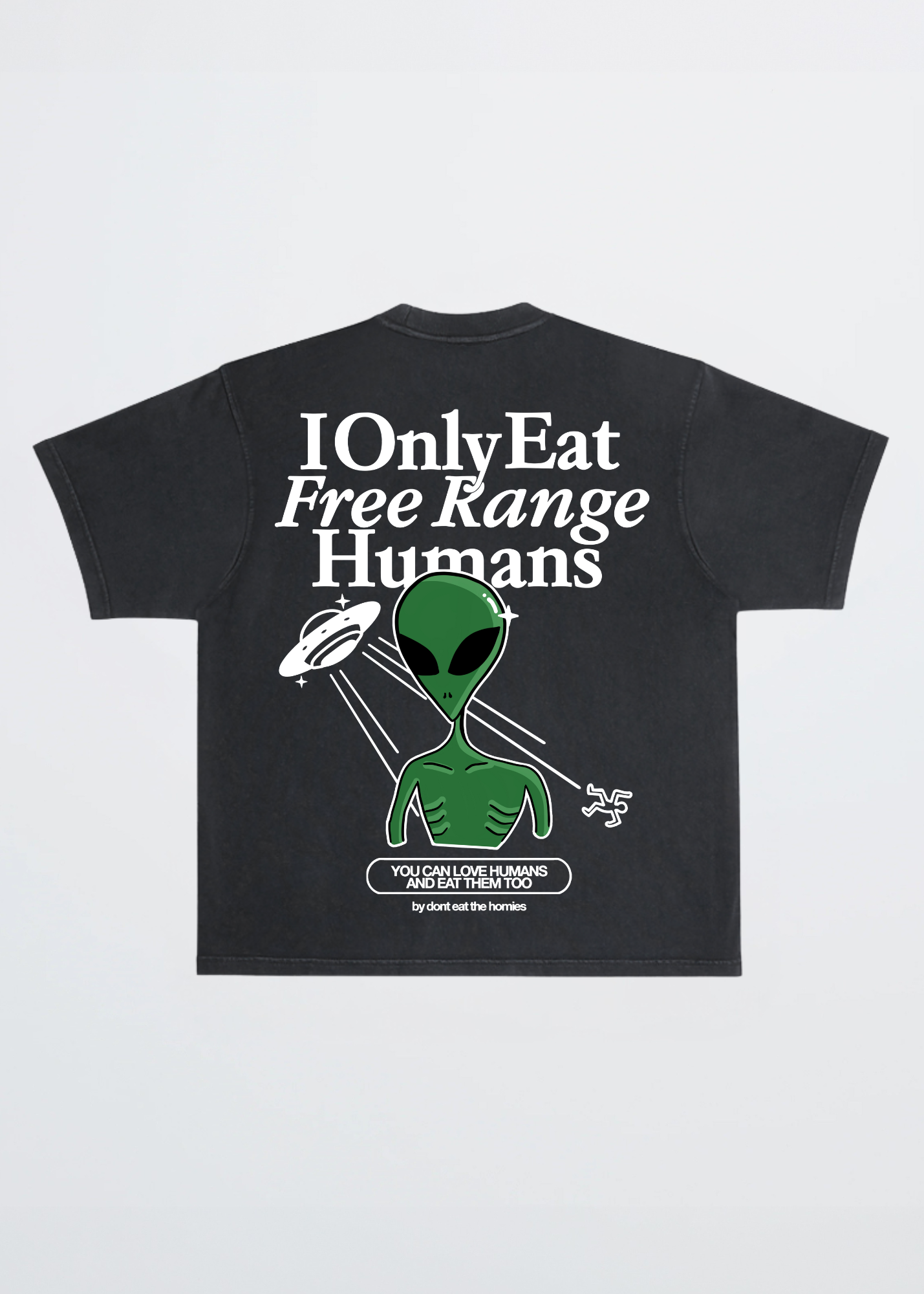 Our heavyweight unisex tee features the "I Only Eat Free Range Humans" graphic on the center back and a smaller alien spaceship graphic on the center chest.