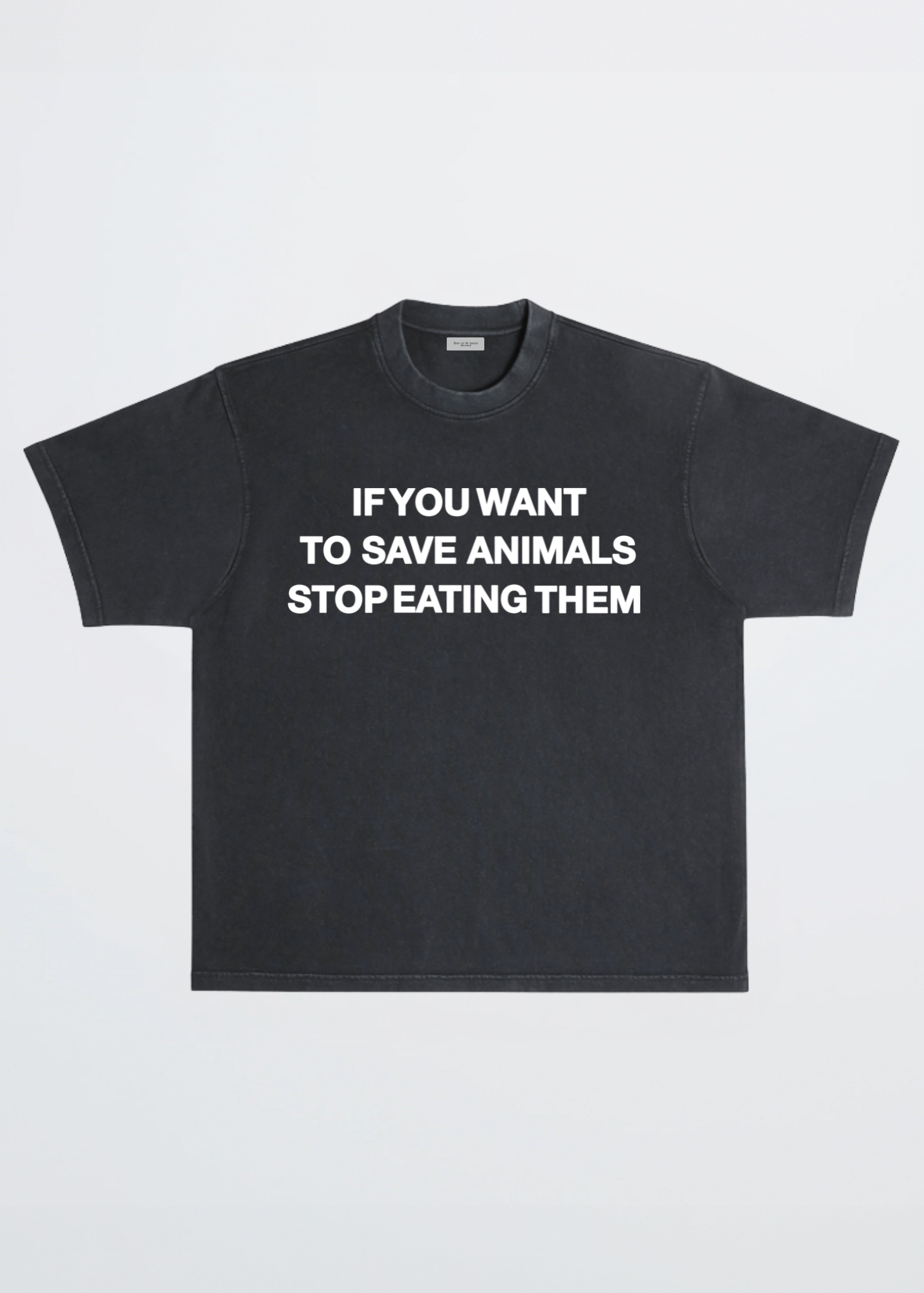 Our new heavyweight tee features the bold "if you want to save animals stop eating them" text on the center chest.